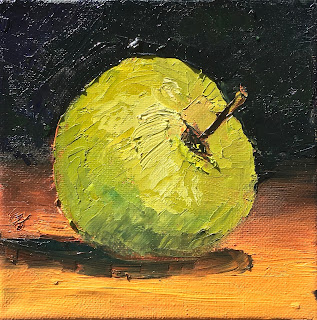 I recently began a self-challenge to paint 12 green apple paintings.  The purpose was to give them away at our neighborhood Bunco event that I was hosting in September.  It was a great challenge and got me the closest ever to becoming a daily painter. I hope you will follow and enjoy the series. They are all 6"x 6" canvas, painted in oils with a palette knife.  Now if I can just post them in 12 days!